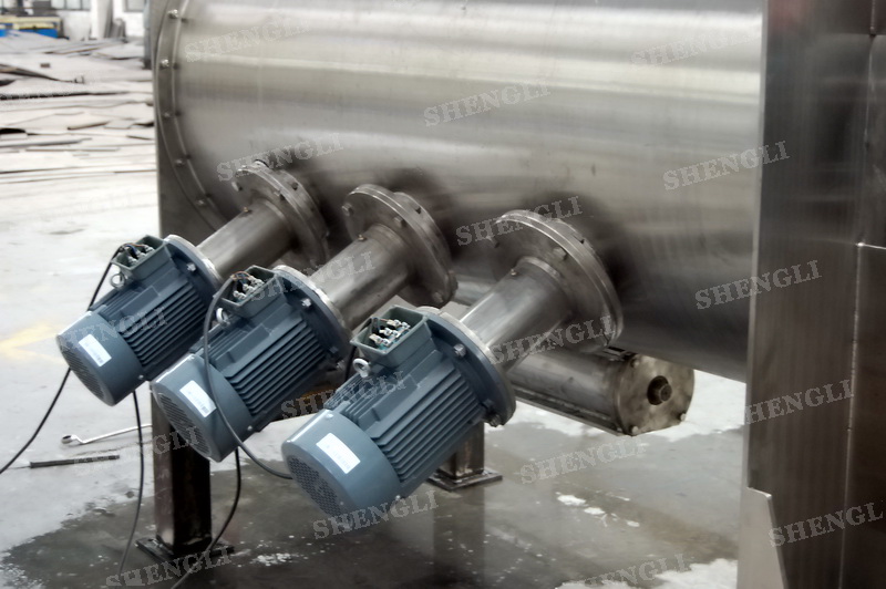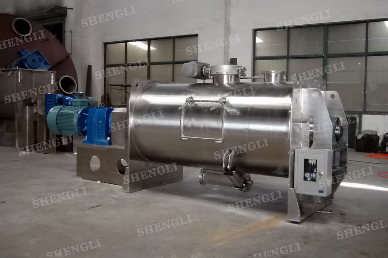 工作原理:犁刀混料機采用臥式圓柱筒體,內(nèi)設(shè)平行主軸,主軸上安裝若干犁式刀頭,通過較快的旋轉(zhuǎn)速度,分割、重合物料,實現(xiàn)快速攪拌的功能,常結(jié)合1500-3000轉(zhuǎn)高速剪切飛刀相互作用。