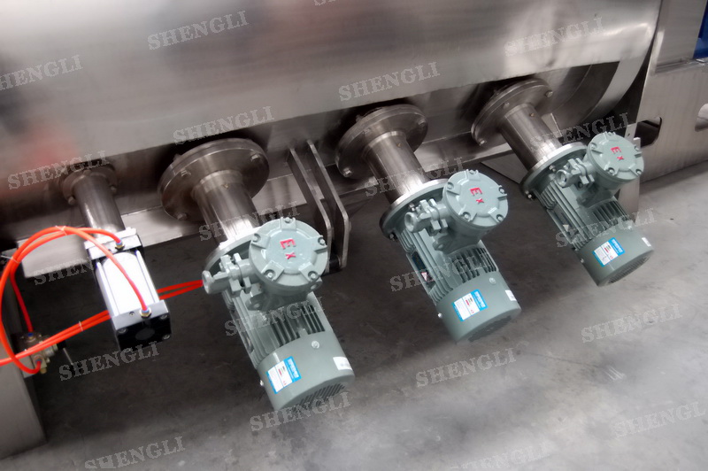 設(shè)備配置:配置R系列減速機(jī),直角安裝;搭載三臺(tái)3000轉(zhuǎn)每分鐘的高速飛刀;筒體外設(shè)導(dǎo)熱介質(zhì)夾套;筒側(cè)開(kāi)設(shè)快開(kāi)式檢修門附安全開(kāi)關(guān);出料口采用氣動(dòng)翻板閥;主軸與飛刀主軸采用氣密封;筒體上設(shè)氣動(dòng)在線取樣閥;設(shè)備內(nèi)表面鏡面拋光、外表面拉絲亞光。