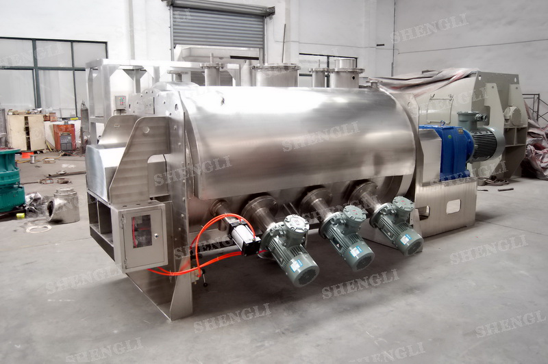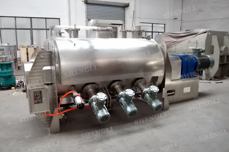 工作原理:犁刀混合機(jī)采用臥式圓柱筒體,內(nèi)設(shè)平行主軸,主軸上安裝若干犁式刀頭,通過(guò)較快的旋轉(zhuǎn)速度,分割、重合物料,實(shí)現(xiàn)快速攪拌的功能,常結(jié)合1500-3000轉(zhuǎn)高速剪切飛刀相互作用。