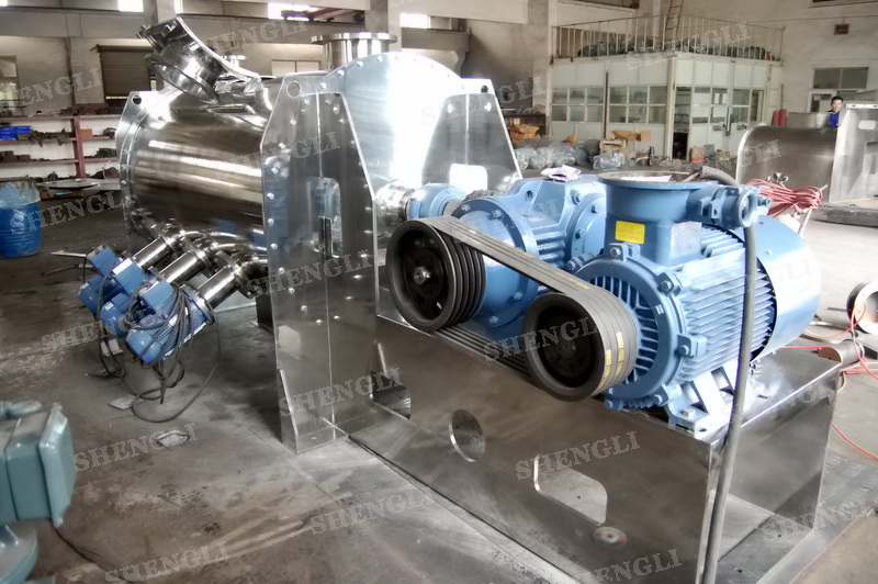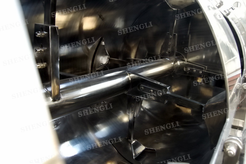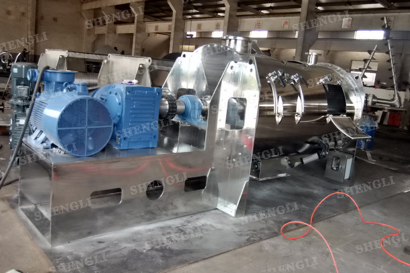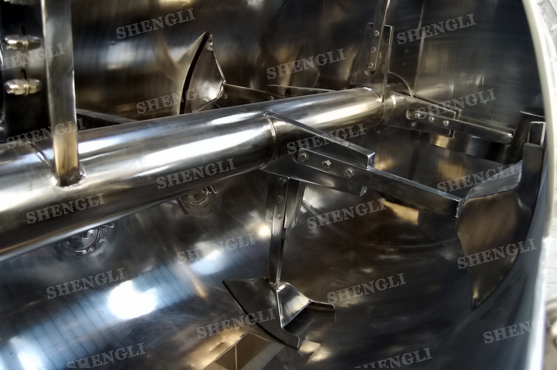 工作原理:犁刀攪拌機采用臥式圓柱筒體,內設平行主軸,主軸上安裝若干犁式刀頭,通過較快的旋轉速度,分割、重合物料,實現(xiàn)快速攪拌的功能,常結合1500-3000轉高速剪切飛刀相互作用。