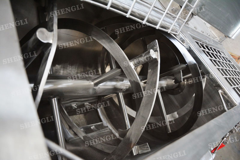 工作原理:螺帶混合設備采用U型筒體,內裝平行主軸,主軸上安裝正反雙向的盤條螺帶,不同維度螺帶分內螺帶與外螺帶,物料在螺帶的驅使下反復參混,能夠快速高效的混合。
