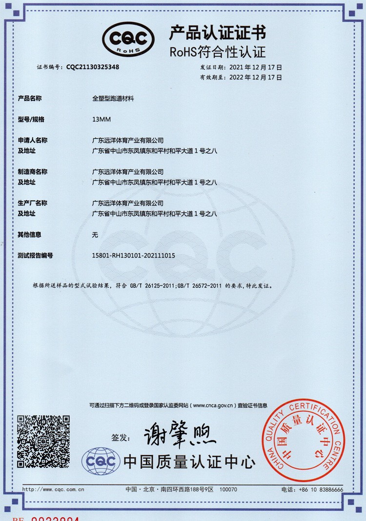 全塑型塑膠跑道RoHS認(rèn)證
